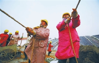 这些女工大多来自附近的村庄,趁着农闲出来打工,孩子交由老人照顾,丈夫则在其他地方为生计奔忙。她们与工地上的男人很少交流,只有一堆女人聚在一起的时候才大声说笑,几位爱干净的女工在工作时始终穿着围裙。她们从事的大都是非技术性工作,但干起体力活,丝毫不输给男人,辛苦一天下来能有不到100元的收入,这对她们来说已经很满足了。