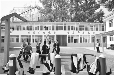 月山工务段党委针对职工工作生活在山区,文化生活单调,工作条件艰苦的实际,加大职工工作生活环境改造力度,配齐各种文体设施,努力为职工创造舒心、优雅的工作氛围,让职工文化生活丰富多彩。图为这个段孔庄线路班组的职工在新铺设的塑胶篮球场开心运动。 王占军 摄
