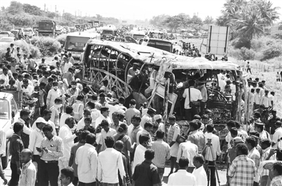 10月30日,在印度南部安得拉邦,人们聚集在事故客车的残骸旁。印度警方当天说,南部安得拉邦当天早晨发生一起恶性交通事故,已致使至少44人丧生。 新华社发