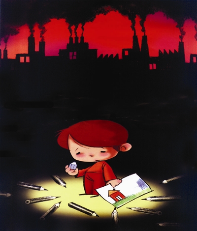 画中有一种沉重。孩子的彩笔难以画出想象中的蓝天绿地和小鸟。朴熙顺(韩国)