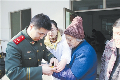 图为邹宁浩给一患阿尔茨海默症老人配带黄手环的情形。