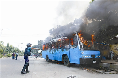 3日,在孟加拉国首都达卡,一名警察向一辆正在燃烧的巴士泼水。孟加拉国主要反对党民族主义党2日宣布从4日起再次举行连续三天的全国大罢工,要求在明年大选中执政党孟加拉人民联盟恢复看守政府制度。民族主义党此前曾于10月27日至29日发起为期三天的全国大罢工,反对党支持者与执政党支持者及警方在全国多地发生冲突,造成至少11人死亡,数十人受伤。新华社发