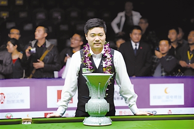 11月4日,丁俊晖获胜后与冠军奖杯合影。当日,在四川成都举行的2013世界斯诺克国际锦标赛决赛中,中国选手丁俊晖以10比9战胜中国香港选手傅家俊,夺得冠军,成为21世纪以来连续夺得三站排名赛冠军的第一人。