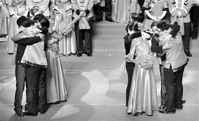 11月3日,在刚投入使用的福州工人文化宫里,“百对新福州人集体婚礼”举行。两对新人分别与父母紧紧拥抱。来自山东的一位新福州人代表说:“我刚来福州时举目无亲,几年下来,我不仅学到了技能还收获了爱情并安了家,过几年再把爹娘接过来……”