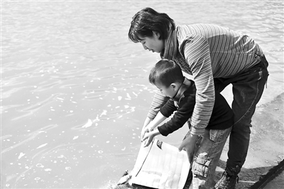 11月3日,昆明举行第四届放鱼滇池生态保护行动,众多市民前来参与。活动共准备了5吨左右的鲢鱼、鳙鱼鱼苗供市民投放,以达到“以鱼控藻、以鱼减污、以鱼养水”的目的,进一步改善滇池水域的生态环境。这是一位母亲带着孩子往滇池里投放鱼苗。