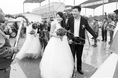 11月2日,河南商城县境内的国家重点工程宁(南京)西(西安)铁路南阳至合肥段增建二线工程建设工地,哈建公司的7对青年人也收获了甜蜜的爱情果实。光荣的大别山为背景,火热的工地是舞台,他们让青春之花在参与祖国建设中绽放得更美,婚礼一结束就又投入到紧张的施工中。 王秉良 钟善良 摄