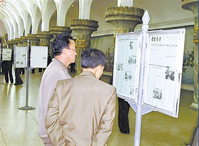 10月24日,平壤地铁站里的阅报栏。朝鲜劳动党中央机关报《劳动新闻》刊登了中国新闻代表团访问朝鲜的消息。陈鑫 摄
