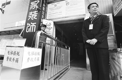 11月7日,湖南衡阳,物业人员在大厦入口处执勤。自本月1日起,衡阳蒸湘区丽天名园大厦业委会要求非正式住户进入电梯收取1元/次的电梯损耗费。对此,业委会相关负责人解释,大厦有45家经营公司,随着外来人员逐年增多,3台电梯才运行3年就全部更换了。同时,外来人员素质参差不齐,影响了居民的正常生活,迫于无奈才出此对策。