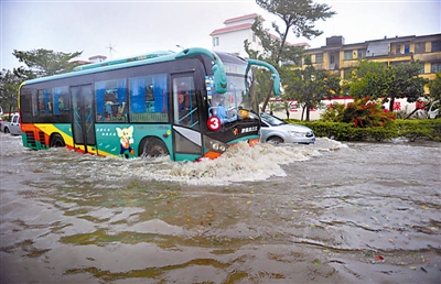 11月10日,受强台风“海燕”影响,海南三亚市区积水严重,车辆只能涉水而行。