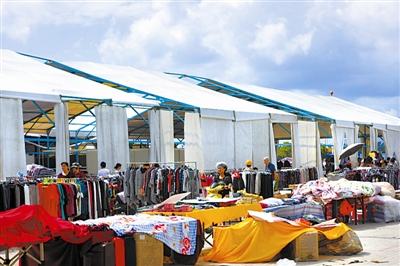 11月12日,在海南省琼海市万泉河广场,商家边晾晒货物边低价抛售货物。
