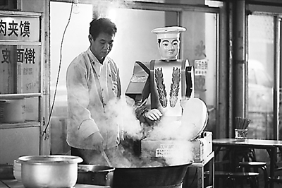 11月11日上午9时,西安市北大街中段一处巷子内,开面馆的张海波在制作臊子,他旁边的削面机器人是店里的好帮手。这个机器人是张师傅花了7000多元购买的,用了半年多了,老张对他非常满意,老张说:“现在雇一个面点师傅一个月得三四千元钱,买个机器人虽然贵点,但是一次性投入,而且它‘任劳任怨’,非常划算。” 董国梁 摄/CFP