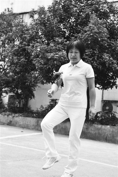 她是一名专职打字员,也是一位技艺超群的毽子达人;业余时间练就了脚上的绝活:两分钟,单脚背踢毽子148个