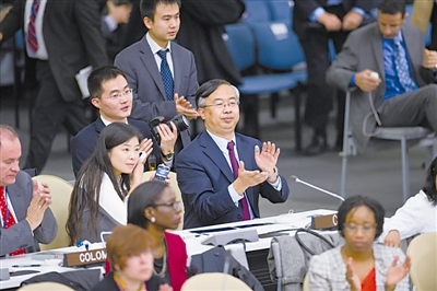 12日,中国常驻联合国副代表王民(中)在纽约联合国总部参加联合国人权理事会选举。第68届联合国大会当日改选联合国人权理事会成员,中国以176票当选,任期自2014年至2016年。新华社记者 牛晓雷 摄
