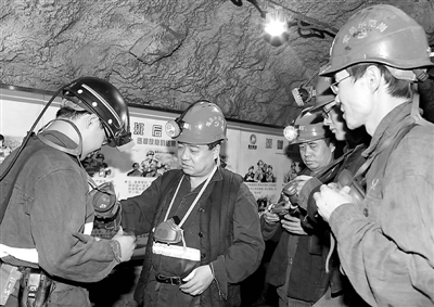 图为矿工下井前在互相检查防尘口罩。蒲德贵 摄
