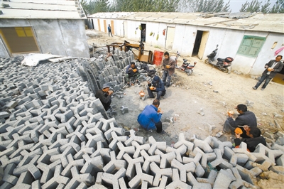 ←10月27日,在南水北调中线工程河南安阳段一工地,工人们正在简易工棚前就地吃午饭。在工地上干活的大都是四五十岁的男人,对吃住不奢求 ,每月能有3000多元的收入。