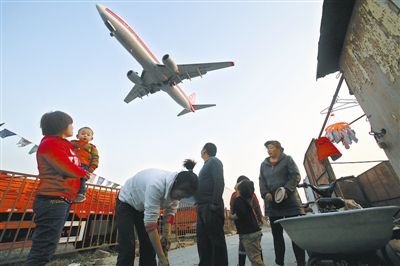 ←10月26日,北京南苑机场边一简易集装箱改造的房屋旁,来自河南信阳的杨克刚一家请来师傅帮助自家腌制过冬的咸菜,一架准备降落的飞机呼啸而过。杨克刚一家在机场边已经打工六年,孩子在附近的打工子弟小学上学。