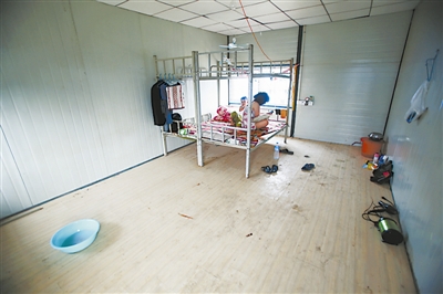 → 8月6日,沈阳一工地板房内,一位妇女和孩子在等老公下班。他们上午刚从老家坐了5个小时的大巴来到沈阳市,老公把他们接到工地后就匆匆上班去了。工地有规定,工人来了家属,可以免费住几天单间。