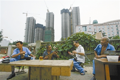 ↑8月4日,在青岛市中心一空地里,几位保洁员晚饭后聚在一起唱戏消遣。 他们中年纪最大的接近70岁,许多都是老两口一起干活,他们的孩子也大都在城市打工谋生。