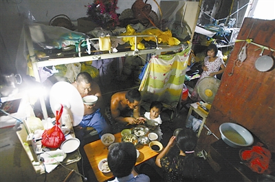 ↑8月4日,在青岛市中心的一块荒废的空地上,何庆彬(图左)夫妇和工友一家子挤在几平方米的废弃平房里搭伙吃饭。今年64岁的何庆彬和老伴在打工中,每人每月能有1300元收入,家里的老母亲已经90岁, 两个儿子在老家务农。