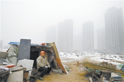 1月23日,在河北石家庄高新区一即将竣工的高档楼盘内,申书庆老人在自己搭建的狭小窝棚边执勤。2011年他从河北邢台来工地当保安,每月收入2000元。时值寒冬,他只能多穿点衣服、睡觉时多盖床被子硬扛着,因为这里 不让生火炉,怕发生火灾。