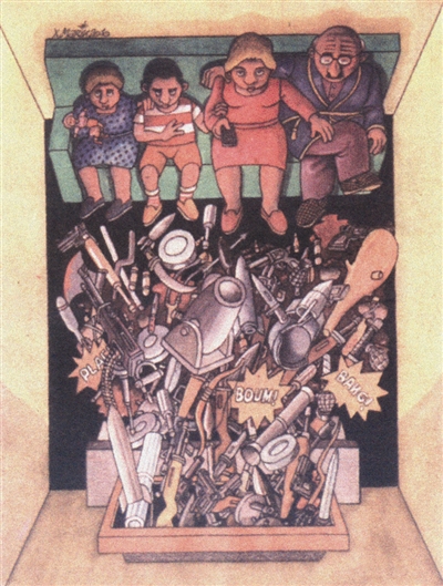 电视里杀人越货和行凶暴力,对孩子造成极大伤害。作者采用俯视角度绘制,更让读者观后惊骇。卡 许(斯里兰卡)