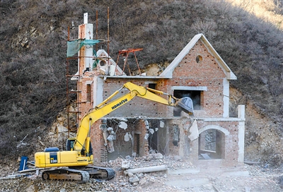 11月25日,工人在北京昌平区南口镇虎峪村拆除虎峪自然风景区内的“小产权别墅”。