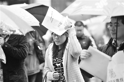 11月24日,在济南市山东师大校园考点,考生冒雨参加2014年国家公务员考试。