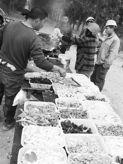 对市场敏感的商家适时推出工地餐饮,有自选炒菜、酱卤菜品,甚至连粥都有近十种可供选择,价格合理,外观诱人。