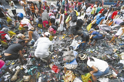 菲律宾台风灾民在泥地里翻找杂货店商品