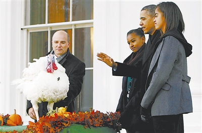 11月27日,在美国首都华盛顿,美国总统奥巴马(右二)和他的两个女儿萨沙(左二)、玛莉娅(右)赦免一只名叫“爆米花”的火鸡。当日,美国总统奥巴马在白宫举行一年一度的感恩节火鸡赦免仪式,一只名叫“爆米花”的火鸡连同它的同伴,一只名叫“焦糖”的火鸡,一道获得了当年的总统感恩节“特赦”。新华社记者 方喆 摄
