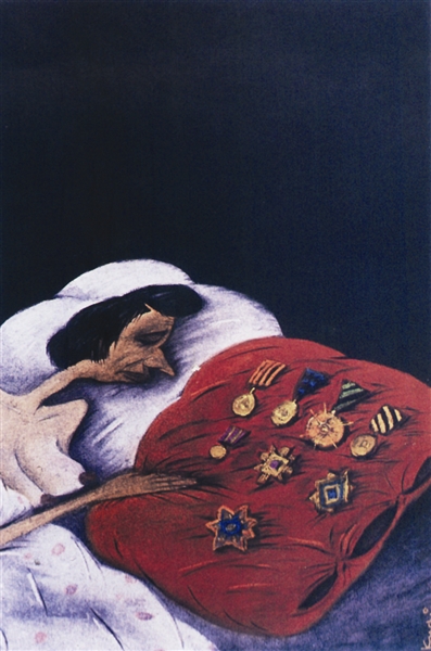 这幅画画的是丈夫常年驻守边防。独守空房的妻子只能与丈夫的勋章为伴苦度时光……