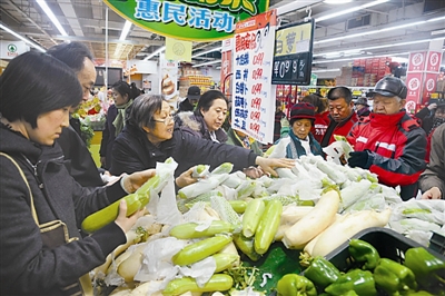 12月2日,太原美特好超市平阳路店,市民抢购“一元菜”。据介绍,入冬以来,山西太原市的鲜细菜主要由外地供应,且价格出现明显上涨。太原市委市政府动用价调基金对新增“一元菜”进行补贴,保障蔬菜供应。