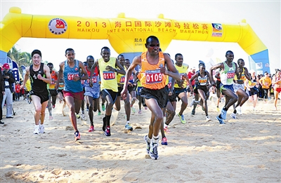 亚洲规模最大、中国首次举办的沙滩马拉松赛事日前在美丽的海口西海岸假日海滩举行,来自21个国家的402名马拉松职业及业余选手和近2000名迷你马拉松爱好者参赛。