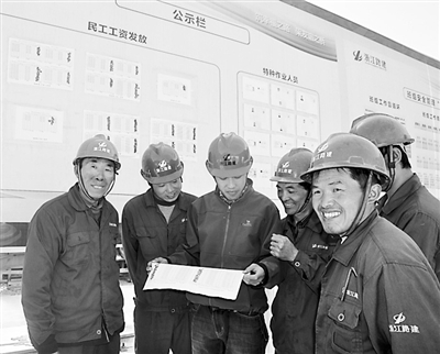 图为第14标段项目部预制场农民工正在看10月作业人员工资发放表。