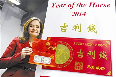 12月3日,在美国首都华盛顿,美国财政部官员罗茜·里奥斯展示农历马年限量版一美元“吉利钱”。美国财政部造币和印钞局当日宣布,为庆祝即将到来的中国农历马年,自4日起发行2014年版生肖马主题限量版“吉利钱”一美元纸币。