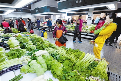 12月5日,浙江省台州市黄岩区新堂村村民在农贸市场选购蔬菜。