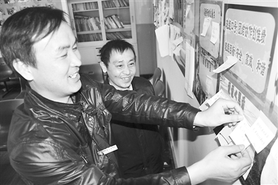 11月27日,安徽淮北矿业朱仙庄矿修护二区两名职工正通过“对话墙”向领导表达诉求。该矿基层单位在管理看板上增设 “说句心里话”栏目,职工可通过该栏目对领导干部工作作风、工资分配、安全生产、劳动保护等提出意见建议或直接表达诉求,领导干部每天查阅对话栏上的留言,并跟帖答复,较好地拉近了干群距离。王道玉 摄