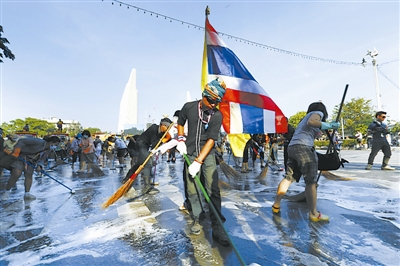 当地时间2013年12月4日,泰国曼谷,反政府示威者正在清扫街道。东方IC 供图