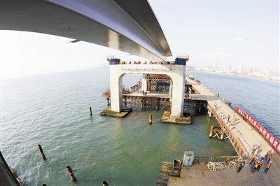 12月6日,在大连南部滨海大道跨海大桥施工现场,第一节梁箱顺利安装完毕。