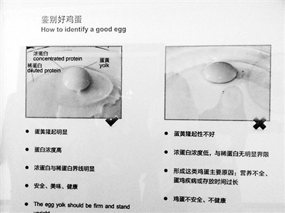 于建平说,首先从外壳看,摸新鲜的鸡蛋不会像老的鸡蛋那样特别光滑,稍微会有一点麻的感觉。第二要看蛋黄,标准的、正常的鸡蛋蛋黄应该是浅黄色,看起来深红或者深黄应该不是很正常。第三,一般新鲜的蛋黄老百姓叫没有散掉,蛋黄是很独立的,蛋黄里面膜看起来把蛋黄包的很紧。第四看蛋白,鸡蛋里面蛋白分两部分,一个是稀蛋白,一个是稠蛋白,如果时间长了这两部分蛋白看起来会很混、很稀,新鲜的鸡蛋两部分蛋白界限是分明的。