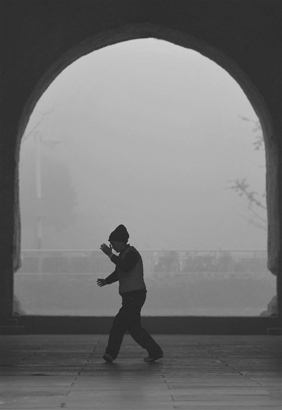 12月8日,市民在大雾笼罩的南京明城墙下锻炼身体。