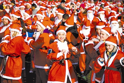 当地时间12月8日,在英国伦敦维多利亚公园,当地民众身着圣诞老人的服装,参加5公里或者10公里的慈善长跑。参与者可以为自己希望捐助的慈善项目募资。当天在欧洲其他一些城市也举行了“圣诞老人”长跑比赛。阿健 供图