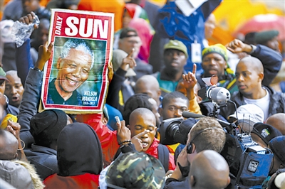 12月10日,在南非约翰内斯堡FNB体育场内,前来参加追悼活动的群众举着一张印有曼德拉头像的海报等待活动开始。南非前总统曼德拉追悼大会10日在约翰内斯堡的FNB体育场隆重举行,近百名各国元首、政府领导人以及约10万名南非民众参加。 新华社记者 张晨 摄