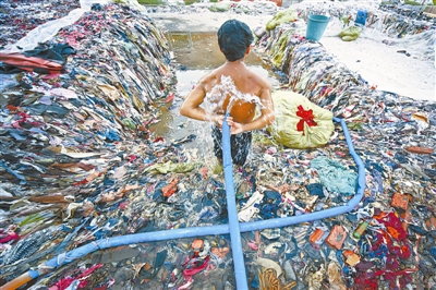 在浙江苍南县,随着当地再生纺织行业的发展,小褪色污染成为一大生态公害。图为2010年8月16日,工作了一天的工人在冲去一身的污染灰尘。欧阳世忠/东方IC