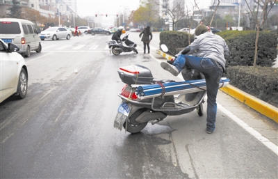 12月10日,西安市最低温度已低至-3℃。清晨,一些路段上的洒水车并未停止作业,洒水过后路边结了一层薄冰,使得事故频发。
