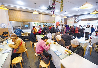 上图:12月12日,南宁市民在素餐馆排队打饭就餐。右图:12月12日,一名市民在就餐后自觉投币。