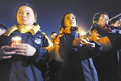12月12日,南京江东门小学的学生手捧红烛祭奠南京大屠杀遇难者。当晚,侵华日军南京大屠杀遇难同胞纪念馆举行“为南京大屠杀遇难者守灵仪式暨和平烛光祭”活动。今年12月13日是南京大屠杀遇难同胞遇难76周年纪念日。 新华社记者 韩瑜庆 摄