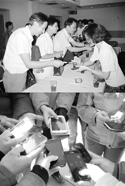 下图:一群年轻人通过微信“一起按,加朋友”的功能添加彼此为好友(摄于2013年11月30日)。