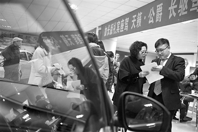 12月15日晚,天津一汽车4S店内,许多市民持币抢购汽车。天津市政府当日召开发布会向公众发布,自12月16日零时开始天津实施无偿摇号与有偿竞价相结合的限牌措施。2014年3月1日开始实施限行措施,每日和每周限行的尾号与北京一致。佟郁 摄/中新社
