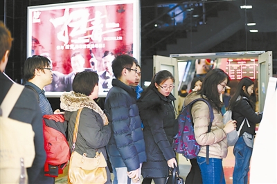 北京海淀双榆树附近的华星国际影城内,在贺岁影片《扫毒》的巨幅宣传海报下,观众正排队从自助购票机上购买电影票。